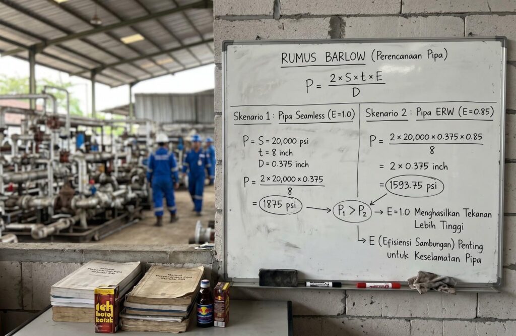 Perdebatan pipa welded vs seamless tekanan tinggi dapat diselesaikan melalui Barlow’s Formula. Persamaan ini mengkuantifikasi korelasi antara dimensi tabung, batas luluh material, dan kapasitas batas tekanan (Burst Pressure). Sama halnya dengan disiplin hitungan dalam menghitung berat besi beton, formula ini meniadakan asumsi kosong di lapangan.